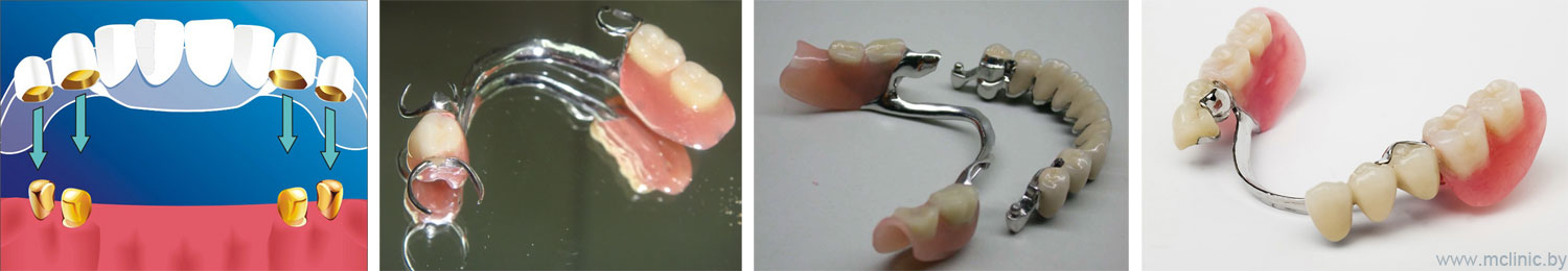 Протезы на базе кламмерной фиксации делаются под зуб, благодаря чему хорошо удерживаются на нем, не портят эмаль. Однако при улыбке можно будет заметить металлические детали (в случае, если они будут находиться на линии улыбки).