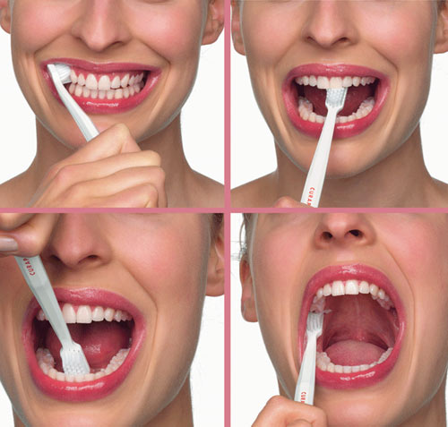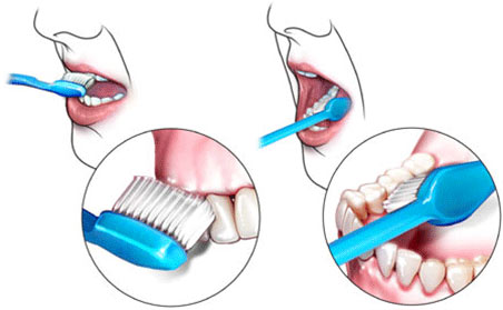 - располагаем щетину зубной щетки под углом 45 градусов по отношению к линии десны и производим короткие круговые движения по направлению от десны к режущему краю зубов. Таким образом тщательно очищаем каждый зуб;