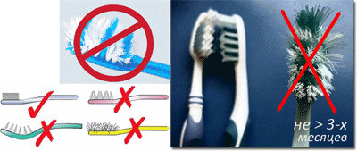 Сама щетка должна иметь формы и размеры, позволяющие добраться до всех областей полости рта без затруднений. Особенно не рекомендуется пренебрегать вечерней чисткой зубов (перед сном), т.к. неубранный налёт и пища, образовавшиеся в течение дня, способствуют бурному размножению бактерий, что, в свою очередь, создает благоприятную среду для развития кариеса и воспаления дёсен; - Производите замену зубной щетки не реже, чем раз в три месяца (или раньше, в случае если щетинки щетки износились).