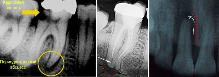 Наиболее часто болезнетворные бактерии попадают в корневой канал зуба при запущенной форме пульпита. В этом случае инфекция направляется через кариозную полость в пульпу зуба, проходит через отверстия корневых каналов и таким образом попадает в периодонт, вызывая в нем образование периодонтального абсцесса (гнойного мешочка).